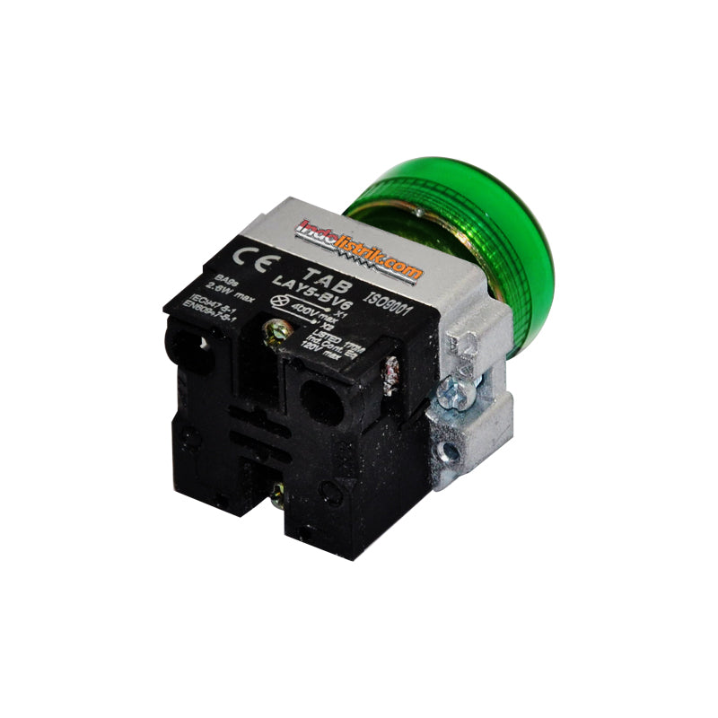 TAB Pilot Lamp Bohlam 22 mm LAY5-BV63 hijau digunakan untuk indikasi arus di panel listrik agar memudahkan mengontrol ada atau tidaknya arus listrik di panel tersebut. TAB Pilot Lamp Bohlam LAY5-BV63 memiliki diameter 22 mm, panjang 50 mm dengan bentuk kepala bulat berwarna hijau dan tegangan 220 V AC, sangat ringan dan compact. Mudah dalam pemasangan dengan cara dihubungkan langsung pada sumber listrik (Direct) pada perakitan panel listrik. Diproduksi berdasarkan standard International IEC 60947 dan EN 60947. Pilot Lamp / Lampu indikator / lampu untuk panel, cocok digunakan di rumah, gedung perkantoran, pusat perbelanjaan dan pabrik industri.