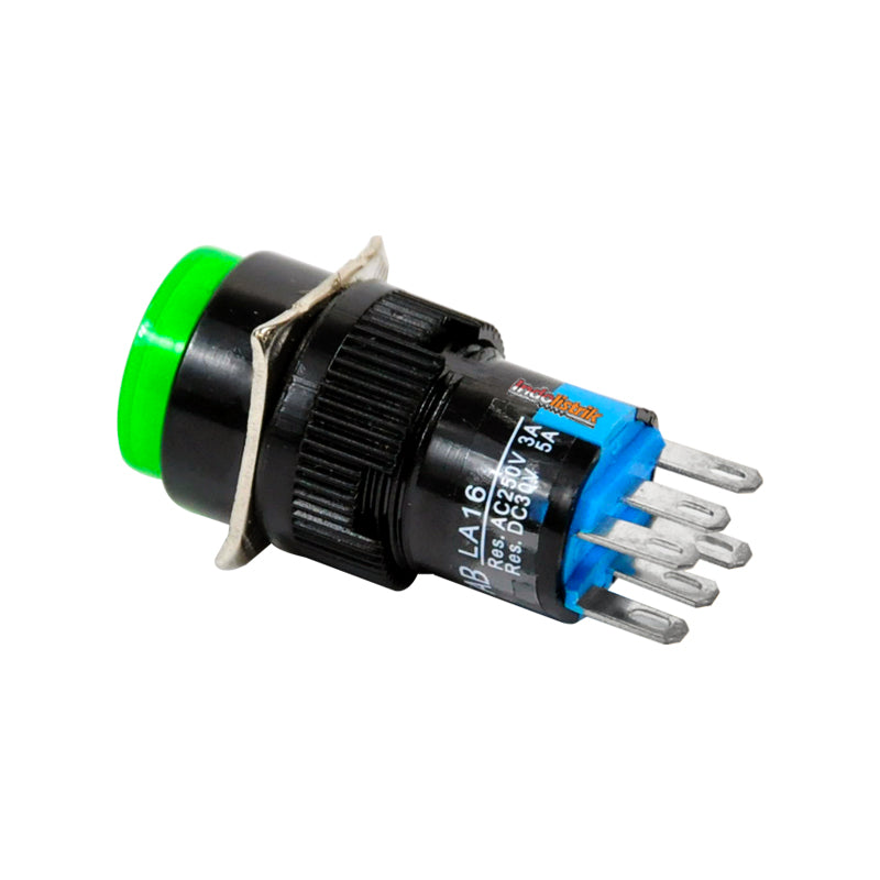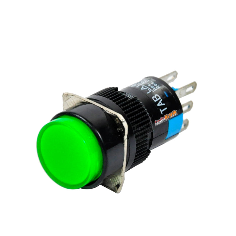 Push Button 16 mm LA16Y-22 Bulat Hijau digunakan sebagai saklar untuk menghubungkan dan memutuskan aliran arus listrik dengan cara ditekan. Push button LA16Y-22 model bulat berwarna hijau memiliki diameter 16 mm, memiliki kontak 2 NO dan 2 NC. Push Button 16 mm LA16Y-22 dengan sistem Momentary / spring return artinya akan menghubungkan atau memutus aliran arus listrik pada saat ditekan dan pada saat tidak ditekan (dilepas), maka akan kembali pada posisi normal. Mudah dalam pemasangan, penggunaan dan tahan lama. Diproduksi berdasarkan standard International. Push button / Saklar Push button / Saklar tombol tekan, cocok digunakan di rumah, gedung perkantoran, pusat perbelanjaan dan pabrik industri.