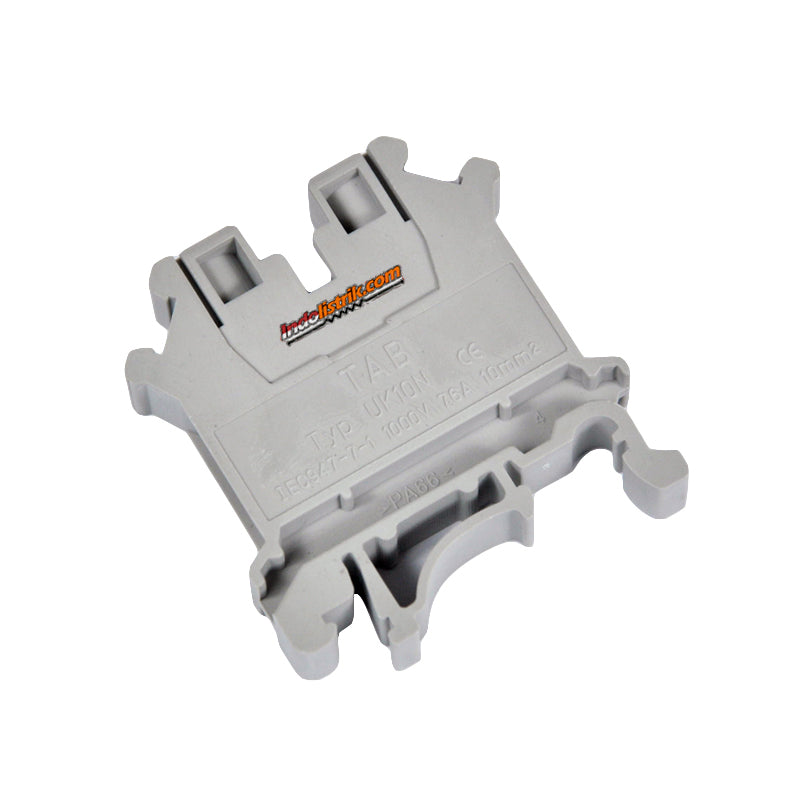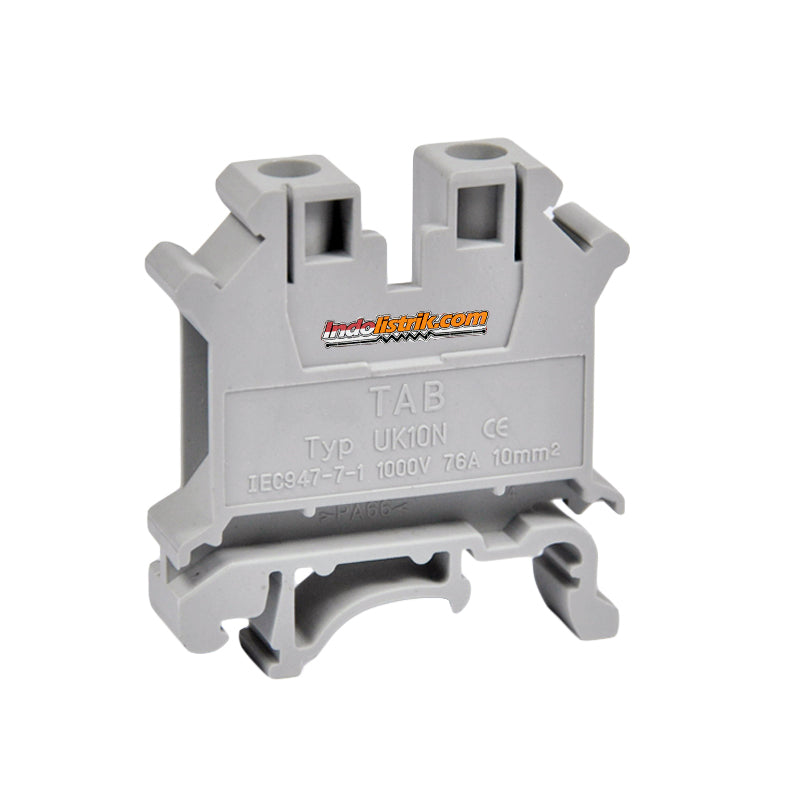 TAB Terminal blok UK 10N Abu-abu digunakan untuk menghubungkan arus dari komponen yang satu ke komponen yang lain. Dapat juga digunakan sebagai jumper atau penghubung apabila ada penambahan komponen. TAB terminal blok UK 10N berwarna abu-abu dengan rating arus 76 ampere untuk ukuran kabel 10 mmsq. Perakitan panel listrik dengan menggunakan terminal blok dapat menghemat biaya pada perakitan komponen listrik dengan penggunaan kabel yang lebih sedikit. Terminal blok memberi perlindungan optimal pada komponen, karena apabila terjadi konsleting, arus akan terputus di terminal blok sebelum sampai di kompnen utama. Terminal blok type UK merupakan terminal 1 pole yang dapat dipasang saling berdampingan satu dengan yang lain untuk menyesuaikan dengan jumlah pole yang di perlukan. Mudah dipasangkan pada DIN rail 1 fungsi dan dapat dilepas dan ditambah sesuai kebutuhan. TAB terminal blok UK memiliki kualitas tinggi terbuat dari bahan yang dapat memperlambat atau menghambat nyala api. Mudah dalam pemasangan, penggunaan dan tahan lama. Diproduksi berdasarkan standard international. Terminal block / blok terminal / Terminal connector, dapat digunakan untuk perakitan panel listrik, component electronic dan automotive dan cocok digunakan di gardu listrik, perkantoran, rumah, gedung, dan pabrik industri.