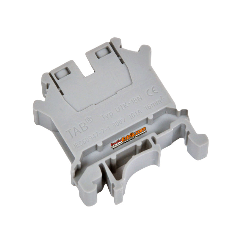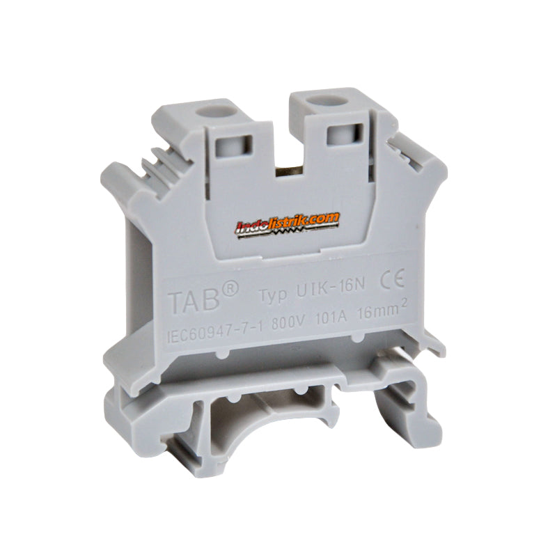 TAB Terminal blok UK 16N Abu-abu digunakan untuk menghubungkan arus dari komponen yang satu ke komponen yang lain. Dapat juga digunakan sebagai jumper atau penghubung apabila ada penambahan komponen. TAB terminal blok UK 16N berwarna abu-abu dengan rating arus 101 ampere untuk ukuran kabel 16 mmsq. Perakitan panel listrik dengan menggunakan terminal blok dapat menghemat biaya pada perakitan komponen listrik dengan penggunaan kabel yang lebih sedikit. Terminal blok memberi perlindungan optimal pada komponen, karena apabila terjadi konsleting, arus akan terputus di terminal blok sebelum sampai di kompnen utama. Terminal blok type UK merupakan terminal 1 pole yang dapat dipasang saling berdampingan satu dengan yang lain untuk menyesuaikan dengan jumlah pole yang di perlukan. Mudah dipasangkan pada DIN rail 1 fungsi dan dapat dilepas dan ditambah sesuai kebutuhan. TAB terminal blok UK memiliki kualitas tinggi terbuat dari bahan yang dapat memperlambat atau menghambat nyala api. Mudah dalam pemasangan, penggunaan dan tahan lama. Diproduksi berdasarkan standard international. Terminal block / blok terminal / Terminal connector, dapat digunakan untuk perakitan panel listrik, component electronic dan automotive dan cocok digunakan di gardu listrik, perkantoran, rumah, gedung, dan pabrik industri.