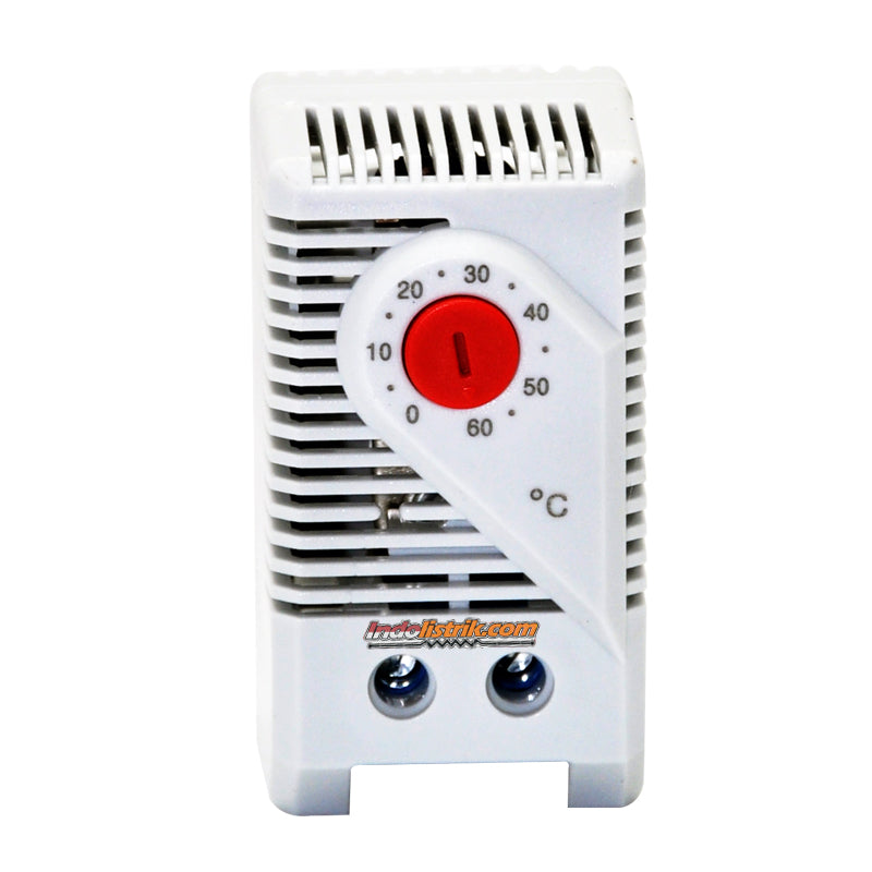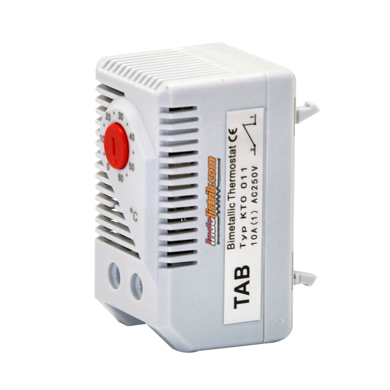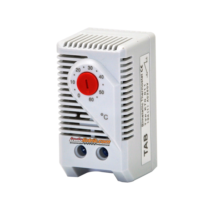 TAB Thermostat KTO 011-F (0-60C) NC 10A 110-250VAC/DC biasanya tertutup atau pemutus kontak yang berfungsi untuk mengatur pemanas, Kontak terbuka ketika suhu naik. KTO 011-F mempunyai aplikasi yang dipasang di Rail MCB untuk menjaga suhu dalam panel listrik, diconnectkan/disambungkan dengan fan/kipas. Thermostat KTO 011-F memiliki ukuran dimensi 60 x 33 x 43 mm dan bisa mengatur cooling fan 0 - 60 C, menggunakan contact NC dengan tegangan 110 - 250VAC/DC dan memiliki rating 10 Ampere. Terbuat dari bahan yang berkualitas handal berdasarkan International Standard, Mudah dalam pemasangan dan tahan lama. Thermostat cocok digunakan di rumah, gedung perkantoran, perhotelan, pusat perbelanjaan dan pabrik industri.