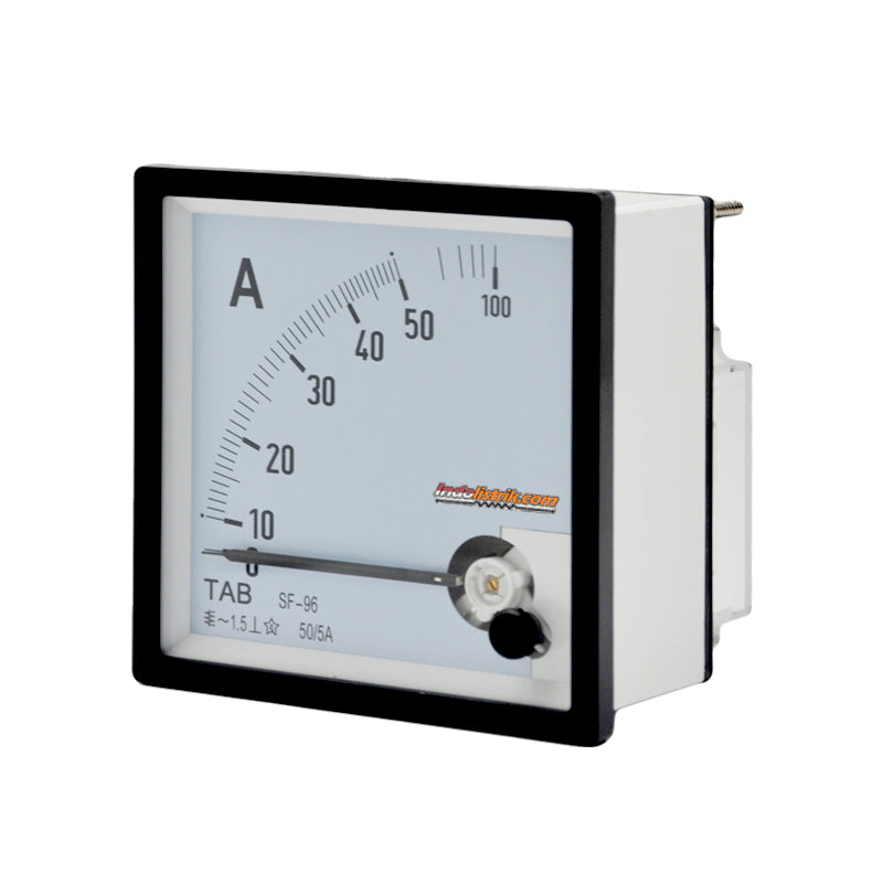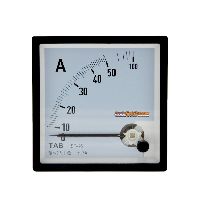 TAB Ampere Meter Analog 96x96 Via CT 50/5 Ampere digunakan untuk mengukur kuat arus listrik yang ada dalam rangkaian tertutup. TAB Ampere Meter Analog 96x96 Via CT 50/5 Ampere memiliki ukuran penampang 96 x 96 mm dengan sistem pengukuran moving iron overscale 200% In dan menggunakan coil berkualitas untuk memberikan hasil pengukuran optimal, akurat dan handal. Casing terbuat dari ABS yang flame retardant sehingga aman untuk digunakan. Diproduksi sesuai standard Internasional. TAB Ampere Meter Analog 96x96 Via CT 50/5 Ampere dalam pemasangannya perlu dihubungkan dengan Current Transformer (CT) terlebih dahulu, sebelum dihubungkan dengan sumber listrik. Compatible untuk digunakan dengan panel metering lainnya seperti current transformer, voltmeter, selector ampere, pilot lamp merek TAB dan merek lainnya. TAB Ampere Meter Analog analog / Ampere Meter Analog Via CT / Metering / Ammeter / Panel indicator / Ampere Meter Analog AC, cocok digunakan untuk perakitan berbagai panel listrik di rumah, gedung perkantoran, pusat perbelanjaan dan pabrik industri.