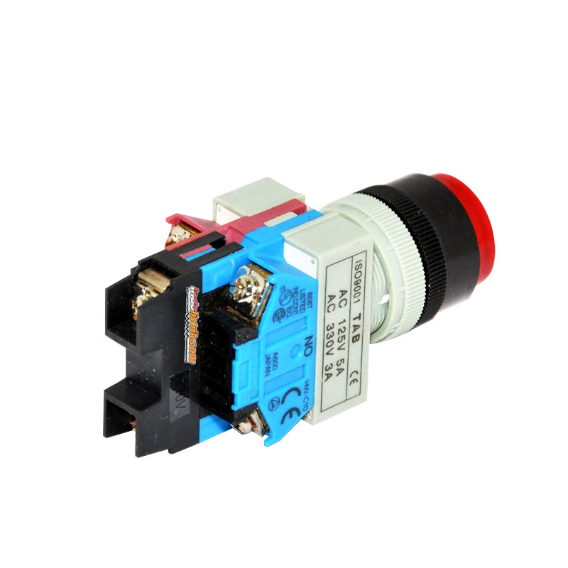 TAB Illuminated Push Button 220 V AC ALW29911EP merah digunakan sebagai saklar untuk menghubungkan atau memutus aliran arus listrik dengan sistem kerja tekan. TAB Illuminated Push Button ALW29911EP berwarna merah dengan model kepala bulat extended head berdiameter 22 mm atau 25 mm yang dilengkapi drat pengunci yang bisa diatur antara 22 mm atau 25 mm memiliki tegangan 220 V AC dan kontak 1 NO + 1 NC. TAB Illuminated Push Button ALW29911EP bekerja dengan sistem Momentary / spring return artinya akan menghubungkan atau memutus aliran arus listrik pada saat di tekan dan pada saat tidak di tekan (di lepas), maka akan kembali pada posisi normal. Mudah dalam pemasangan dengan menghubungkan langsung ke sumber arus listrik atau direct. Diproduksi berdasarkan standard International. Push button / Saklar Push button / Saklar tombol tekan cocok digunakan di rumah, gedung perkantoran, pusat perbelanjaan dan pabrik industri.
